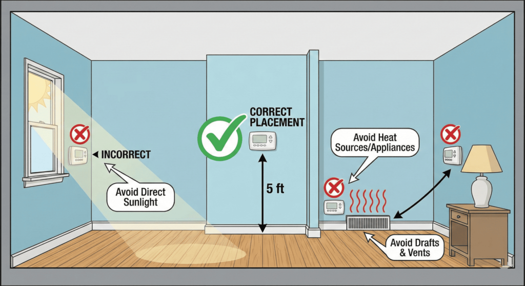 Thermostats should be placed on interior walls about 5 feet above the floor, away from direct sunlight, appliances, and air vents. If your thermostat is near a window or a heat register, it may misread temperatures, causing your furnace to cycle improperly.